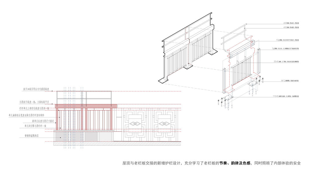 七十年代修建的审评楼悬挑走廊上的栏板,在挑梁对应位置立有现浇构造短柱。浇筑的扶手厚重,一方面方便趴扶,另一方面也构成了短柱间的联系梁。而扶手下方则是预制的水泥镂空栏板单元,既足够结实,又尽可能减少自重,它与扶手以不同颜色的水洗石装饰,并在预制栏板中心创造出植物的主题纹样,充满了韵律和色彩的音乐感。